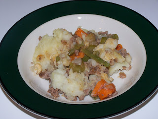 Brown meat. Saute onion in olive oil. Add celery and carrots, saute for a few minutes. Mix together ketchup with the hot water. Combine all ingredients in a 9x13 baking dish. Top with thick layer of mashed potatoes. Bake 30-45 minutes at 375 degrees until potatoes are lightly browned on top.